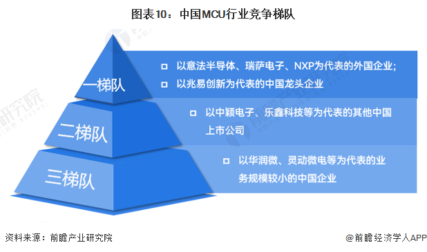 在中国市场中将MCU企业按照梯队划分,以企业在MCU行业的营收和技术水平为标准,第一梯队为以意法半导体、瑞萨电子、NXP为代表的外国企业,以及以兆易创新为代表的内地龙头企业;第二梯队为以乐鑫科技、中颖电子为代表的内地上市公司;第三梯队为以华润微电子、灵动微电等为代表的内地企业。