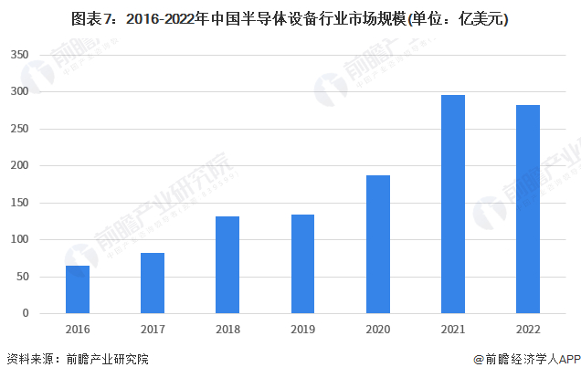 从半导体设备的发展情况来看,2020年中国首次全球最大的半导体设备市场,市场规模达到187.2亿美元。2021年,国内半导体设备市场规模达到近年来最高水平,为296.2亿美元。2022年国内半导体设备市场规模略有下降,为282.7亿美元。
