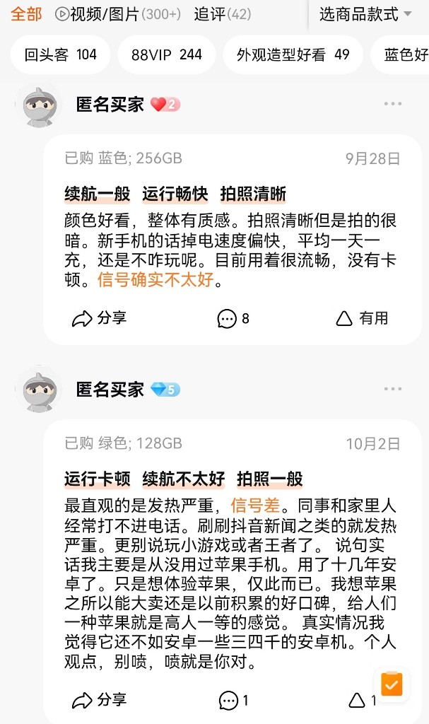 而质量和高返修率等问题,也正让iPhone15系列手机经受考验。不少消费者拿到iPhone 15 Pro后,称其发热严重,甚至出现图像残影、烧屏。在多个电商平台上,苹果新款手机出现的发热严重、耗电快、信号差等问题也引发消费者“用脚投票”。另外,苹果新机iOS17被曝的WiFi连接问题,也引起了网友的围观。