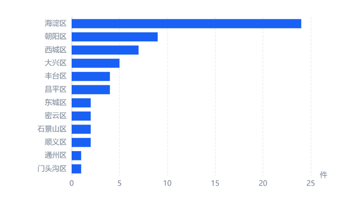 从地域分布看,近1年,海淀区、朝阳区和西城区发生融资事件最多,分别发生24、9和7笔。