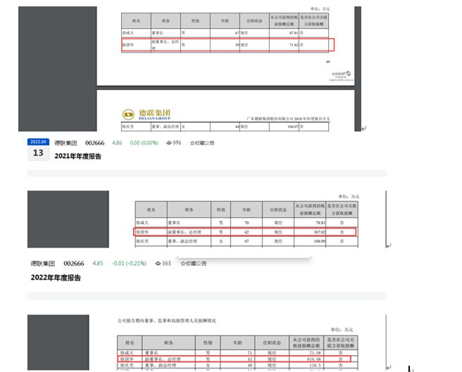 从2022年度来看,报告期内,德联集团录得归母净利润仅有0.41亿元同比下滑83.54%,录得归母扣非净利润仅有0.35亿元同比下滑85.05%。即在2022年度公司营收、盈利均下滑,盈利方面不管是整体盈利还是主业盈利同比均暴跌八成的背景下,作为副董事长兼总经理的徐团华所获得的年度税前报酬却从2021年度的387.02万元大涨一倍多至816.68万元。