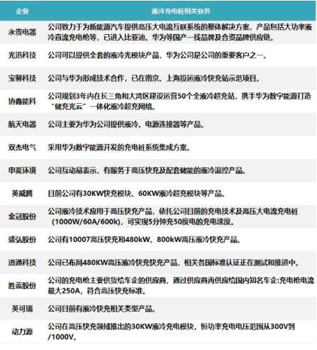 目前,多家企业已瞄准液冷超充市场,2023年多项示范站逐步投入应用,液冷超充产品优势明显,有望依托其较强的适配性迅速拓展下游客户,加速国内相关企业超充产品的研发进度,利好相关产业链发展。