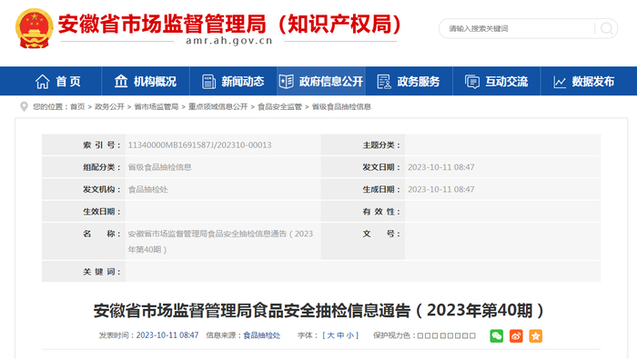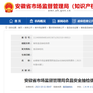 安徽省市场监督管理局发布2023年第40期食品安全抽检信息