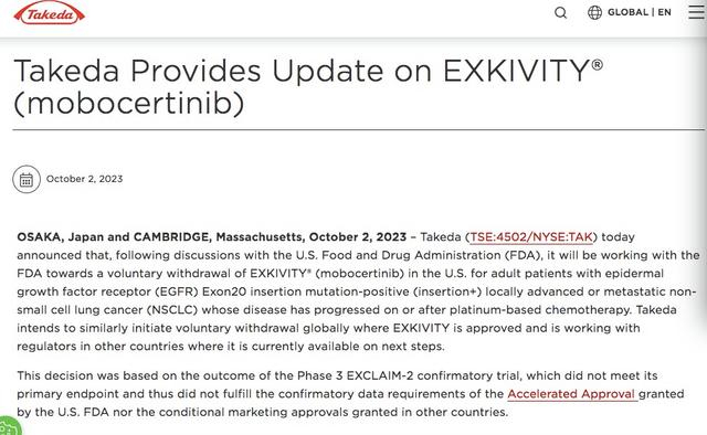 2021年9月,FDA按照加速批准程序,批准莫博赛替尼用于EGFR外显子20插入突变阳性的前序含铂化疗治疗失败的晚期非小细胞肺癌成人患者,并以一线治疗的EXCLAIM-2Ⅲ期临床试验作为确证性试验,以此结果确认长期获益,并将加速批准转为完全批准。此次武田主动启动莫博赛替尼退市正是因为3期EXCLAIM-2试验未达到主要终点。