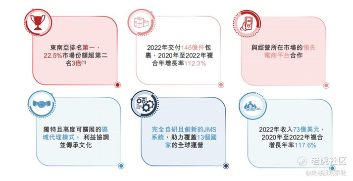 极兔在东南亚地区是排名第一的快递运营商,按2022年包裹量计算,市场份额达到22.5%,2020年至2022年期间,在东南亚完成的快递包裹量的复合年增长率为47.6%。