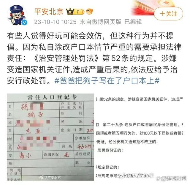 近日,一则新闻引发广泛关注,网友晒出爸爸将狗的信息写在户口本上。网传图片显示,狗的信息被“拟人化”写在户口本上,包括姓名、曾用名、出生地、籍贯、性别等,职业竟是“保安”。不少网友称其“暖心”“好玩”,认为这是将狗视为家人的体现,有人表示也想效仿,将宠物写入户口本。但@平安北京微博提醒公众,这种行为涉嫌变造国家机关证件,有可能因触犯相关法律遭到处罚。