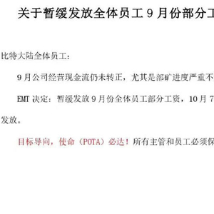 随后网上曝出比特大陆EMT《关于暂缓发放全体员工9月份部分工资的通知》,称:“9月公司经营现金流仍未转正,尤其是部矿进度严重不达标,EMT决定暂缓发放9月份全体员工部分工资,10月7日假期之后视情况发放。”通知还提到,所有主管和员工必须保证完成使命。