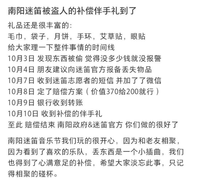 近日,在各大社交平台上,陆续有网友分享了自己收到的补偿伴手礼。一名网友表示,伴手礼包括毛巾、袋子、月饼、手环、艾草贴、眼贴等,他还回顾了整个事情的来龙去脉,“给大家理一下整件事情的时间线:10月3日,发现东西被偷,觉得没多少钱就没报警;10月4日,朋友建议向迷笛官方报备丢失物品;10月7日,收到迷笛志愿者的短信并加了微信;10月8日,定了赔偿方案(价值370给200就行);10月9日,银行收到转账;10月10日,收到补偿的伴手礼。至此赔偿结束,南阳政府&迷笛官方你们做得很好了。南阳迷笛音乐节我们玩得很开心,因为和老友相聚,因为看到了喜欢的乐队,丢东西是一个小插曲。我们也得到了心满意足的补偿,希望大家淡忘此事,只记得相聚的碰杯。”