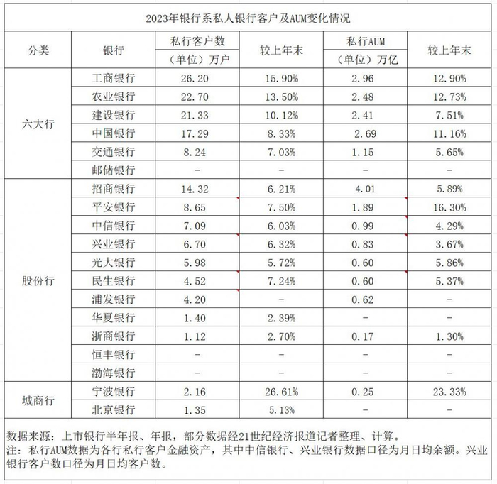 上半年,交通银行私行客户数为8.24万户,较上年末增长7.03%;集团管理私行客户AUM为1.15万亿元,较上年末增长5.65%。邮储银行尚未相关披露数据,该行私行业务相对起步较晚,2023年1月首家私行中心刚刚开业。