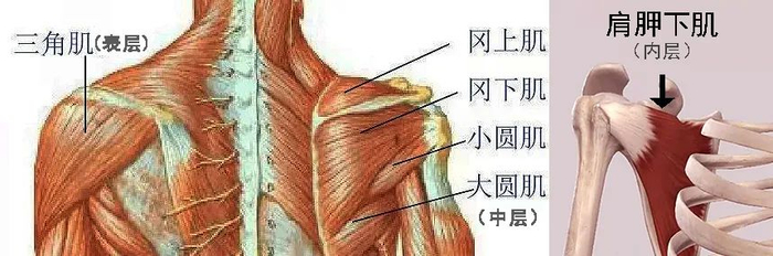 国外有研究通过细丝电极肌电图,对自由泳、蛙泳和蝶泳泳姿过程中肩关节周围上肢肌群的运动强度进行了测定,结果显示冈上肌、冈下肌、三角肌,在三种泳姿手臂的滑水及恢复动作中都需要发力;而肩胛下肌仅参与蝶泳手臂发力的恢复后期和整个划水期,及蛙泳的划水期。
