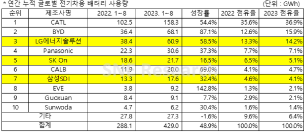 前八月全球动力电池市场中企份额继续增加,宁德时代抵日韩四强