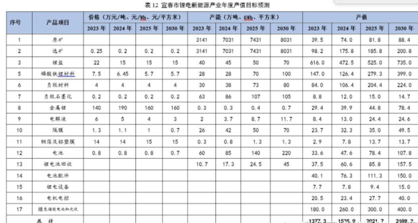 根据《规划》宜春市到2025年碳酸锂产量将达到50万吨,2030年为70万吨。