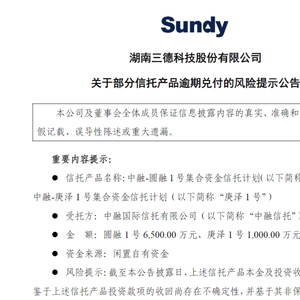 扬子晚报网10月11日讯(记者 马燕)10月11日盘后,三德科技发布公告,提示部分信托产品逾期兑付的风险。所涉及的信托产品为:中融-圆融1号集合资金信托计划(简称“圆融1号”)、中融-庚泽 1 号集合资金信托计划(简称“庚泽 1 号”)。