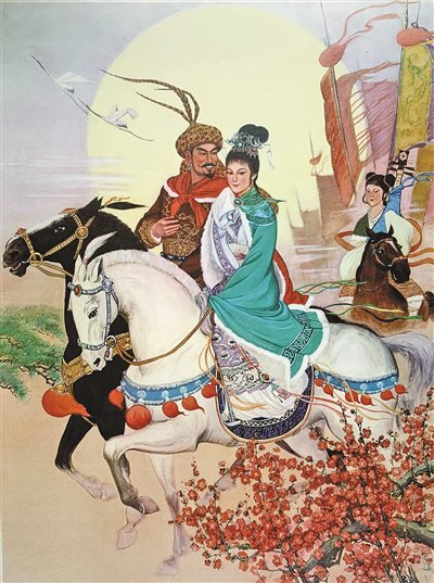 新中国成立后,表现各族人民大团结成为美术创作的一个鲜明时代主题。而在内蒙古,更是美术家们创作的重要内容。“昭君出塞”题材由于其内容的主题性、故事性和地域性,以及独特民族风情的视觉性,受到了许多画家的青睐。从现有资料看,最早表现这一题材的是画家卢宾(1924—1985)。1964年,卢宾创作了中国工笔画《汉明妃和亲图》,作品采用工笔重彩的形式,人物众多,构图舒展,比较贴切地表现了昭君出塞,胡汉和亲的历史佳话。改革开放之初,画家明锐和王延青创作了年画《昭君出塞》(1979年),画面描绘王昭君与呼韩邪单于在一轮巨大的明月映衬下,骑马并行,人物神态含情脉脉,设色浓艳明快,前景的梅花和天空的双鹤既增加了年画所特定的美好气息,又符合作品的主题,是表现这一题材比较优秀的一件年画作品。1980年,正在中央美术学院读研究生的刘大为创作了壁画《昭君出塞》,作品将游牧民族的美好祝福、歌舞内容融入情节描绘,场面宏大,喜庆热烈,洋溢着民族团结的祥和氛围。