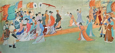 据不完全统计,历代以昭君故事为题材的文学作品高达1360首(篇),真可谓洋洋大观。另外还有郭沫若的历史剧《王昭君》(1924年)、曹禺的话剧《王昭君》(1978年)、不同版本的电影《王昭君》、电视剧《王昭君》、舞剧《昭君出塞》、小提琴协奏曲《王昭君》(1986年)等。本文以美术创作为例,论述这一历史事实是如何生成视觉图像的。传说,中国古代最早给王昭君画像的是当时的宫廷画师毛延寿。后据《宣和画谱》卷七记载,北宋李公麟也曾经画过《昭君出塞》图,可惜未有图像留存。金代画家宫素然作《明妃出塞图》,这是现存最早画王昭君出塞题材的作品。之后,画作无数,有南宋赵伯驹《昭君图》、明仇英《昭君出塞图》、王行《昭君出塞图》,清朝罗聘、华喦、费丹旭、倪田的不同《昭君出塞图》等。这些都为后人继续创作表现昭君题材的绘画打下了坚实的基础。及至近现代,张大千、任率英、刘旦宅、王叔晖等大家都画过这一题材。另外,在我国明清以来的民间年画中这一题材也有大量表现。