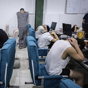 到西港后,鹿鹿带着我去了一家代号为1302的园区。在一栋高大封闭的写字楼里,1302园区占据了十几间办公室。每个办公室有数百台电脑,每个电脑桌上有十几部手机,每个工位上都坐着一个年轻的男子,他们有的脖子上戴着大金链子,有的抽着烟并把烟灰弹在八宝粥罐头里,有的嚼槟榔喝着饮料,第一眼看上去和网吧里的社会青年没什么两样。但实际上,这些人就是从事各种各样诈骗活动的“狗推”,他们时时刻刻都被老板“狗庄”盯着。