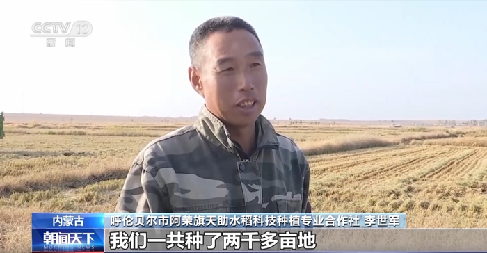 呼伦贝尔市阿荣旗天助水稻科技种植专业合作社 李世军:我们一共种了两千多亩地,派出了六台收割机,计划十天左右能收完,今年是个丰收年。