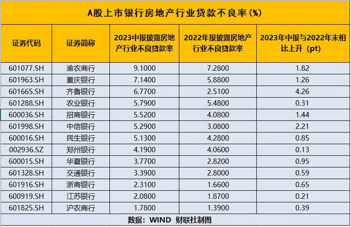 在城商行中,重庆银行的不良率居首,齐鲁银行的不良率增长最快。数据显示,截至2023年6月末,重庆银行的房地产业不良贷款率为7.14%;齐鲁银行的房地产行业不良率为6.77%,排在第二位;厦门银行的不良贷款率为5.22%,排名第三。