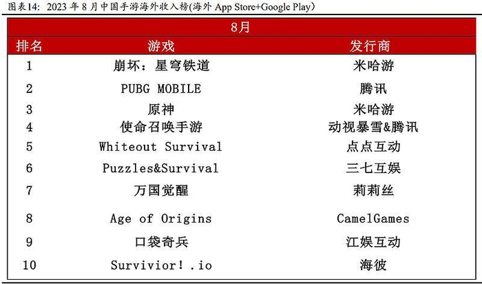 榜单:游戏收入榜呈头部垄断,朝夕光年新游势头强劲。2023年8月中国区App Store iPhone端游戏收入榜单头部稳定,腰部尾部竞争激烈。收入榜单头部前三名依次是腾讯《王者荣耀》、网易《逆水寒》和腾讯《和平精英》,腾讯系游戏8月份前十席位占据6席。《王者荣耀》和《和平精英》两款大体量游戏基于多年平稳运营和暑期促新活动,表现维稳;七月新游《晶核》凭借独特的魔法与机械题材和沉浸式战斗体验,八月延续优异表现,收入增幅显著,排名升至第四位;新游《冒险岛:枫之传说》背靠冒险岛IP,发挥良好,来到榜单第八位。