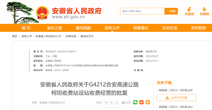 近日,安徽省政府批复,同意在G4212合安高速公路设立柯坦收费站,柯坦收费站自开通之日起收费。具体内容如下。