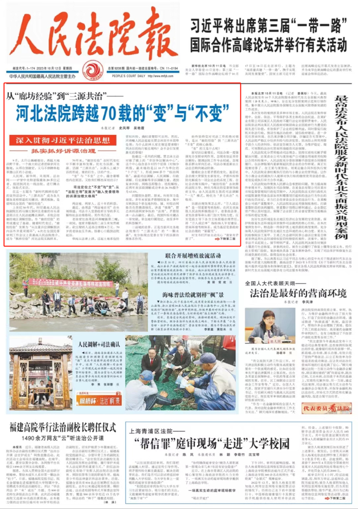 长期关注河北司法变革的全国人大代表武志永评价,河北法院“三源共治”,以柔软的身段,缓和诉讼程序的刚性带来的冲击,实现法理与情理的统一,既是“廊坊经验”的新拓展,也是对新时代“枫桥经验”丰富内涵的再领悟、再发展。