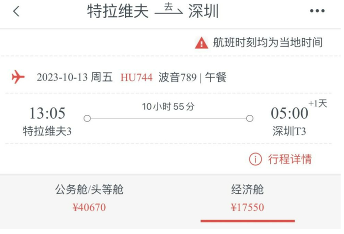 海南航空APP显示,10月11日特拉维夫-北京首都航班,经济舱票价为16400元、公务舱/头等舱票价高达38930元;10月13日特拉维夫-深圳航班,经济舱票价达到17750元,公务舱/头等舱票价则为40670元。从平日票价来看,以11月17日为例,海南航空特拉维夫-深圳航班,经济舱票价最低为4080元一张。