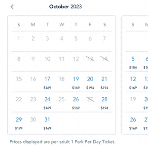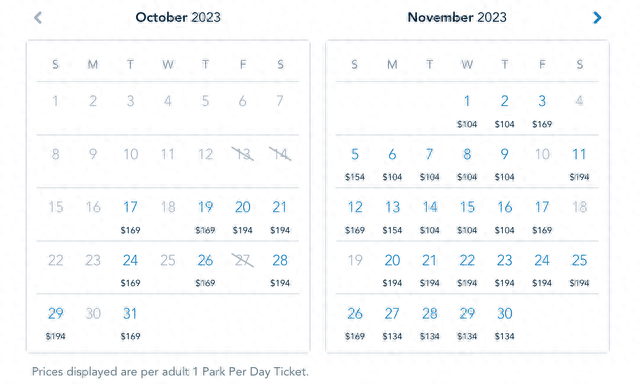 澎湃新闻(www.thepaper.cn)搜索发现,迪士尼两家主题公园10月、11月周六和个别周五的门票价格均已上调至194美元,个别周五的门票价格为169美元,平日最低票价仍为104美元。