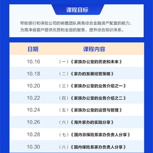 家族办公室正成为高净值人群财富规划领域的“新蓝海”。家族办公室作为高客经营的一种创新模式,是财富管理发展新方向,正不断展现其行业价值。在本次课程内容中涵盖家族办公室的经营策略、运营管理,以及家族办公室的各类业务介绍,课程还涉及国内家办负责人分享及海外家办的实践分享。您将学习到如何为客户提供更专业更丰富的服务以及设计家族办公室愿景、理念、服务内容、经营规划等方面的能力。