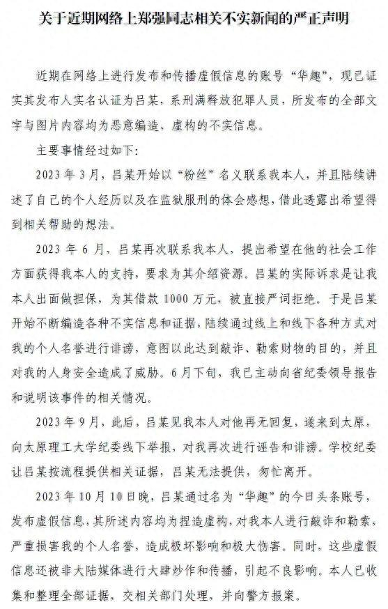 10月12日中午,“郑强教授”微信公号发布声明称,近期在网络上进行发布和传播虚假信息的账号“华趣”,现已证实其发布人实名认证为吕某,系刑满释放犯罪人员,所发布的全部文字与图片内容均为恶意编造、虚构的不实信息。