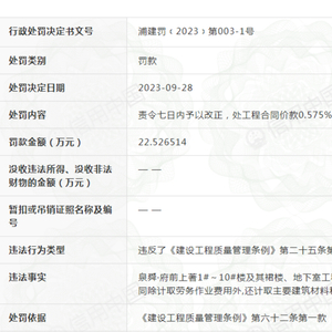 近日,信用中国网站披露,中国建筑第七工程局有限公司因涉嫌施工单位不得转包或者违法分包工程的规定,被福建省漳浦县住房和城乡建设局行政罚款225265.14元。
