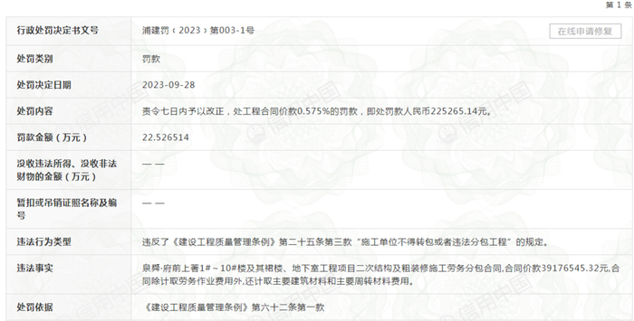 行政处罚文书浦建罚﹝2023﹞第003-1号显示,中国建筑第七工程局有限公司于2023年9月28日在福建省漳浦县泉舜·府前上著1#~10#楼及其裙楼、地下室工程项目中实施了二次结构及粗装修施工劳务分包合同,合同价款39176545.32元,合同除计取劳务作业费用外,还计取主要建筑材料和主要周转材料费用的违法行为。违反了《建设工程质量管理条例》第二十五条第三款“施工单位不得转包或者违法分包工程”的规定。