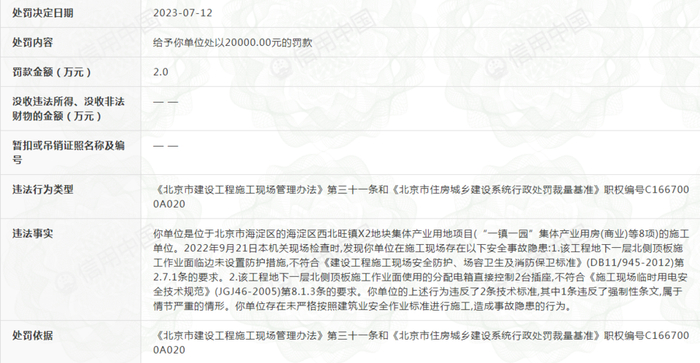 这不是该公司今年第一次被罚,7月12日,中国建筑第七工程局有限公司就因存在未严格按照建筑业安全作业标准进行施工,造成事故隐患的行为,被北京市住房和城乡建设委员会罚款2万元。