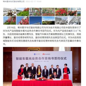 星宇股份与华为的合作,则在去年被提到。据星宇股份公众号,2022年2月,星宇股份与华为在中国东莞举行了华为光产品线智能车载光业务合作意向书签约仪式。