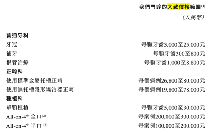 报告期内,患者平均单次就诊需要支付的价格分别为1100元、900元、1100元、1000元以及1000元。以正畸为例,使用标准金属托槽正畸的价格从2.68万元起至8万元不等。而深圳北大牙科种植所披露的价格表显示,使用标准金属托槽正畸价格为1.8万起,远远低于马泷齿科的价格。