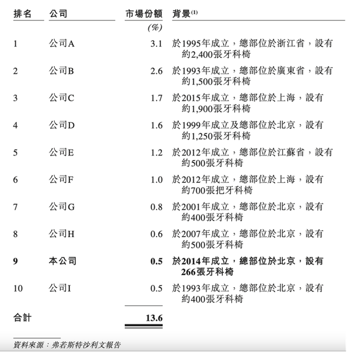 马泷齿科所披露的数据显示,根据2022年收入统计,中国民营口腔医疗服务市场高度分散,在中国前十大民营口腔医疗服务提供商的排名中,马泷医疗占第九位,占市场0.5%份额。