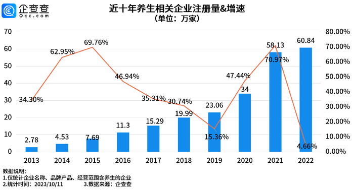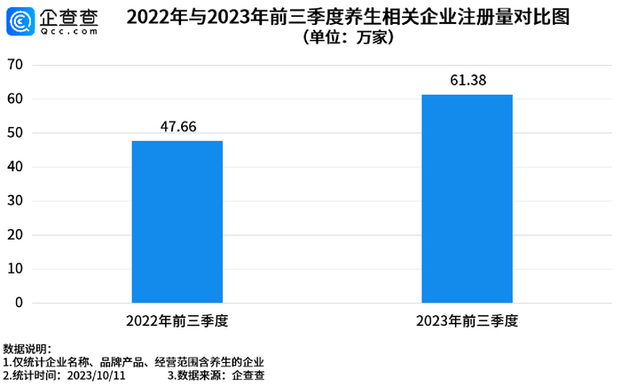 企查查数据显示,截止到目前,2023年我国新增养生相关企业62.51万家,其中今年前三季度新增养生相关企业61.38万家,同比增长28.79%。