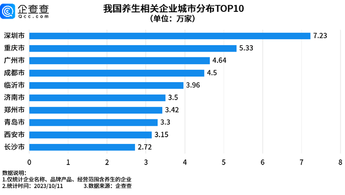 企查查数据显示,深圳以现存7.23万家养生相关企业位列第一,重庆、广州分别现存5.33万家、4.64万家养生相关企业,位列前三。此后是成都、临沂、济南等地。