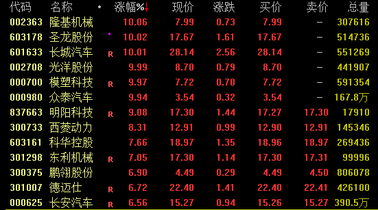 汽车产业链股今日再度走强,截至收盘,隆基机械、圣龙股份、长城汽车、光洋股份、模塑科技、众泰汽车等涨停,明阳科技涨超9%。
