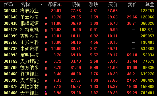 锂电概念今日大幅走高,截至收盘,海辰药业“20cm”涨停,星云股份涨近14%,鹏辉能源涨近12%,江特电机、吉翔股份、永兴材料、中矿资源等均涨停,赣锋锂业涨超8%,天齐锂业涨约7%。