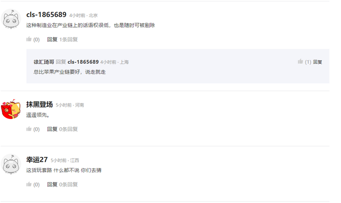 消息一出,众多网友纷纷在财联社APP热议。有人表示,“这种制造业在产业链上的话语权很低,也是随时可被剔除”,还有人表示“总比苹果产业链要好,说走就走”...