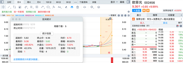 财联社10月12日讯(编辑 宣林 特约编辑 张书维)总市值超300亿元的光学赛道龙头欧菲光尾盘回封涨停,收盘斩获5连板,全天成交金额96.18亿元。