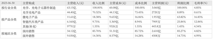 公开信息显示,欧菲光主营业务为智能手机、智能汽车及新领域业务,公司产品包括光学影像模组、光学镜头、微电子及智能汽车相关产品等。截至2023年中,欧菲光光学光电产品的收入44.4亿,占比总营收的70.32%。