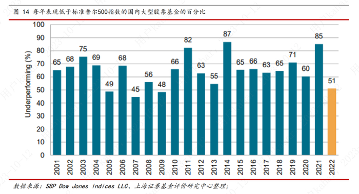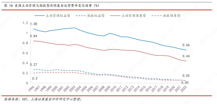 从美国共同基金的变化情况看,随着资本市场的成熟,信息披露、退市等机制日趋健全,主动管理基金的超额收益预计将长期下行,并且在同质化的激烈竞争下,高费率产品吸引力或将下降。