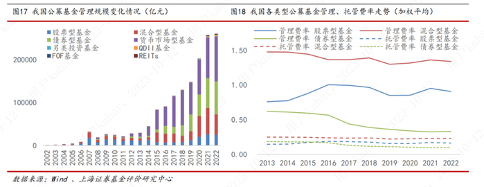 但整体来看,我国公募基金管理、托管费率较为平稳。以规模加权平均的方式进行计算,分类型来看,股票型基金费率有所上升,但呈现先升后降的趋势,管理费率由2013的0.76%上升至1.0%(2016年),随后震荡下行至0.91%(2022年),混合型基金管理费率由2013的1.48%下降至1.30%(2019年),随后上行至1.34%(2022年),债券型基金费率2013年以来呈现下降趋势,管理费率由2013的0.62%下降至0.33%(2022年)。