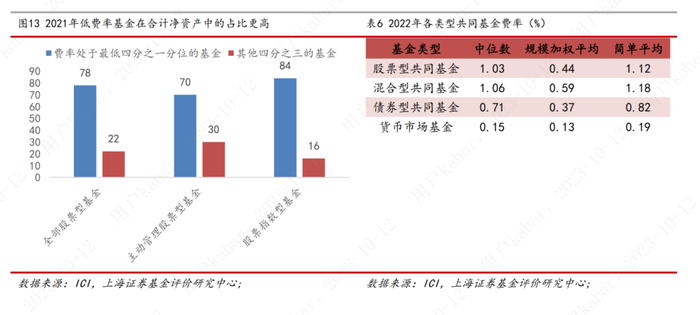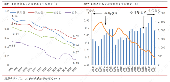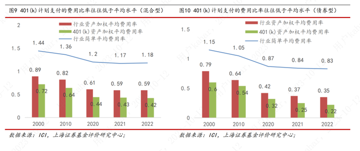 以养老金为代表长期资金,对费率更为敏感,因此在趋势上相应资金更多地投向低费率基金。而ICI的研究也证实了这一点。研究发现:1)401(k)计划的参与者倾向于投资成本较低的共同基金。2)自2000年以来,401(k)计划参与者的共同基金费用比率大幅下降。3)截至2022年底,401(k)计划中95%的共同基金资产以机构和零售免佣基金类别持有,高于2000年底的66%。
