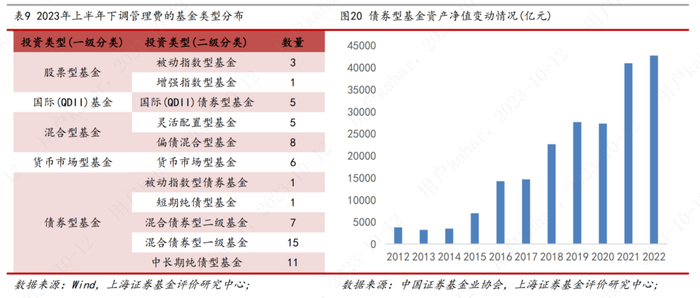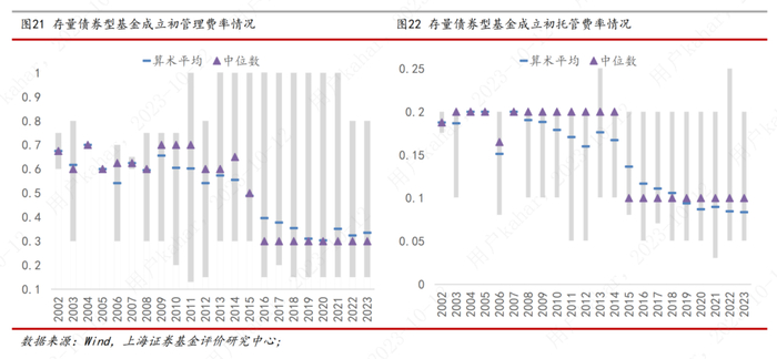 债券型基金费率自2013年以来呈现下降趋势,管理费率由2013的0.64%%下降至0.32%(2022年)。托管费率由2013的0.19%%下降至0.10%(2022年)。