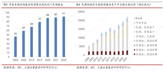 1975年公布的《证券交易修订法案》,废除了固定佣金制度,各家经纪商大力发展投顾业务,通过投顾费用弥补佣金费用的降低。随着美国由卖方投顾模式向买方投顾模式转型,基于交易佣金收费逐步向基于资产付费转移。因此投资顾问为了节省投资者的投资成本也更加倾向于推荐免佣基金。免佣基金获得大量资金流入,其占比也得以持续提升,由此拉动了平均销售费率的下行。据ICI数据,自2000年以来,免佣基金的销售占比持续提高,2022年美国长期基金的销售中,91%的销售额流向了免佣基金。免佣基金占长期共同基金总资产的比例由2000年底的42.6%上升至2021年底的73.2%。