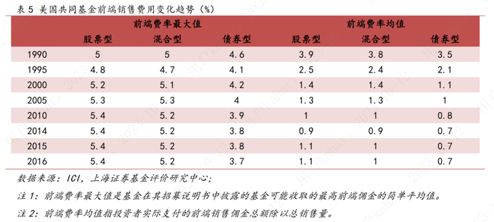 由上图可以看出,美国基金的总持有成本下降的重要原因是一次性的销售费用的下降。投资者实际支付的前端费率在1990-2010年间明显下降。以前端费率为例,根据ICI数据,投资者实际支付的前端费率平均值仅为1.1%,与2010年基本维持在同一水平,较1990年的3.9%明显下降。同样的趋势也发生在混合型、债券型基金上,2016年末两类基金的前端费率均值分别为1%和0.7%。