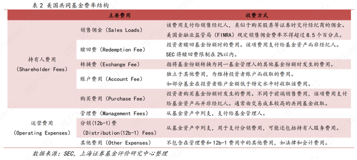 美国证券交易委员会发布的投资者公告,列出了最常见的共同基金费用,将美国共同基金的费用主要分为持有人费用(Shareholder Fees)和运营费用(Operating Expenses)两个部分。持有人费用一般为一次性费用。运营费用通常按照一定比例从基金资产中支付,是投资者间接支付的费用。跟据美国共同基金的监管法规要求,基金年度运营费用比例应在招募说明书中披露。