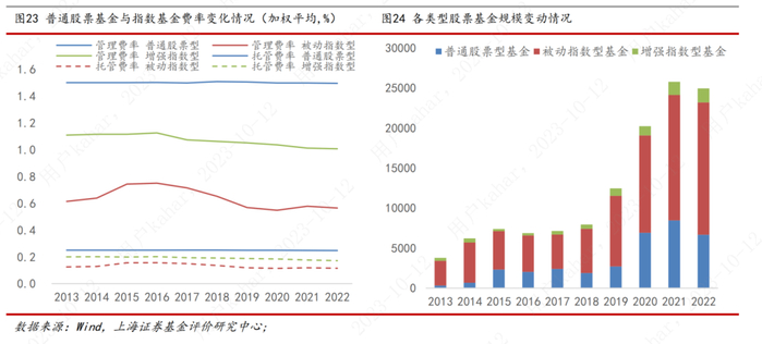 股票型基金管理费率由2013的0.76%上升至1.0%(2016年),随后震荡下行至0.91%(2022年)。托管费率由2013的0.15%上升至0.19%(2016年),随后震荡下行至0.16%(2022年)。但从细分类型看,普通股票型基金管理费率一直稳定在1.5%左右,托管费率也稳定在0.25%。